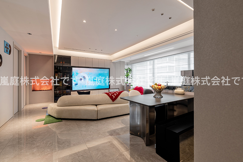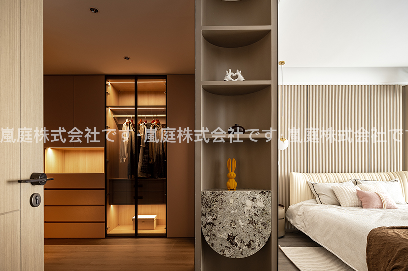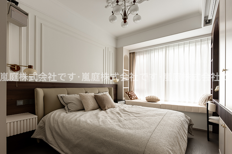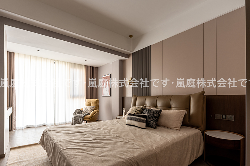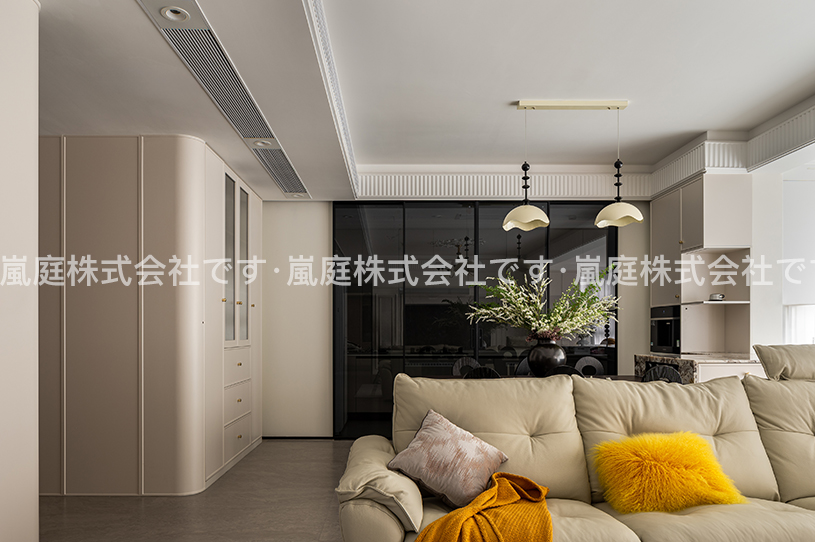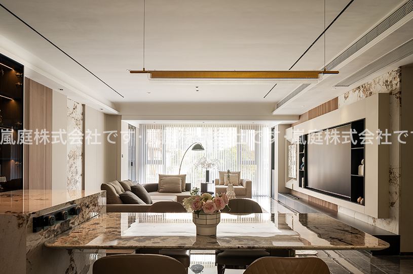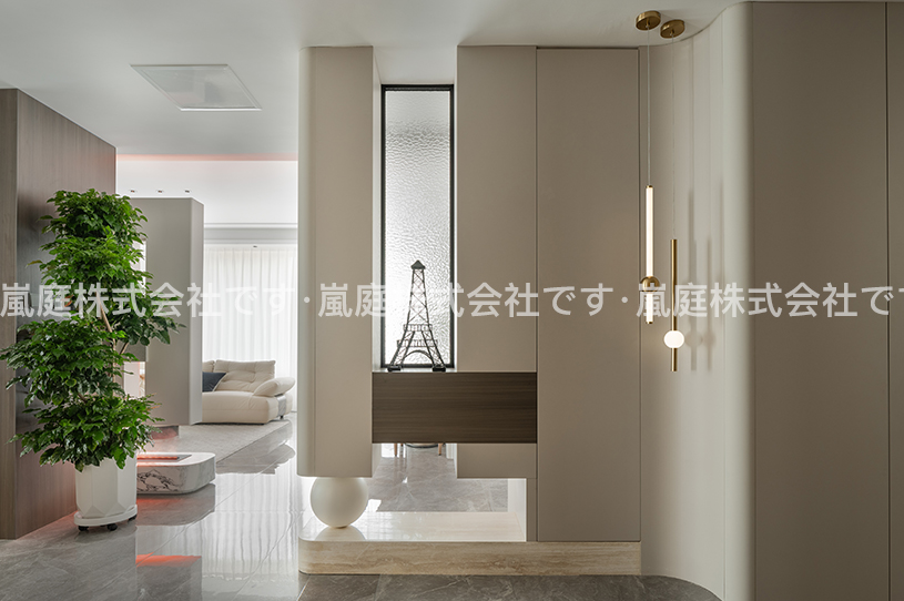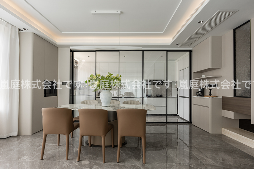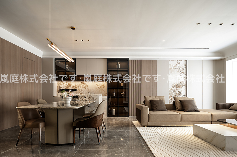 このインテリアはモダンでライトラグジュアリーなスタイルで、高級素材とニュートラルトーンが主で、ラインがシンプルで、質感と優雅さを兼ね備えている