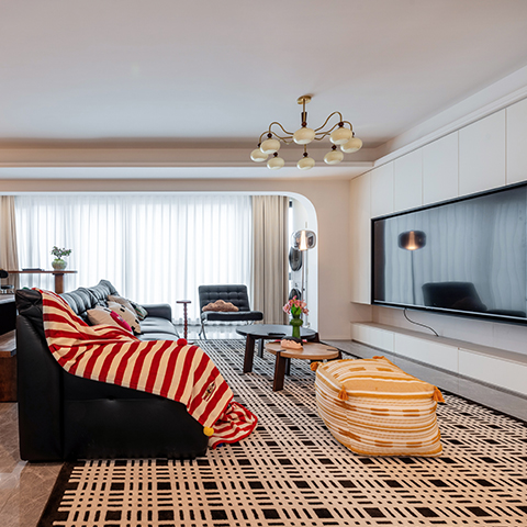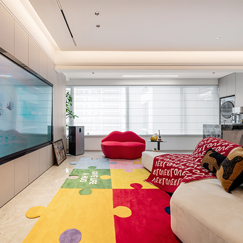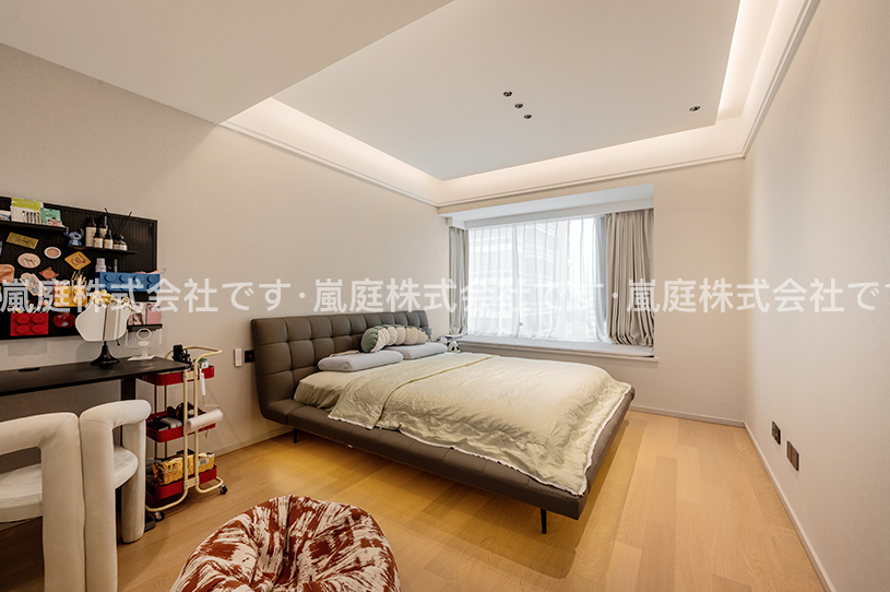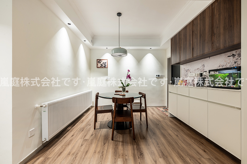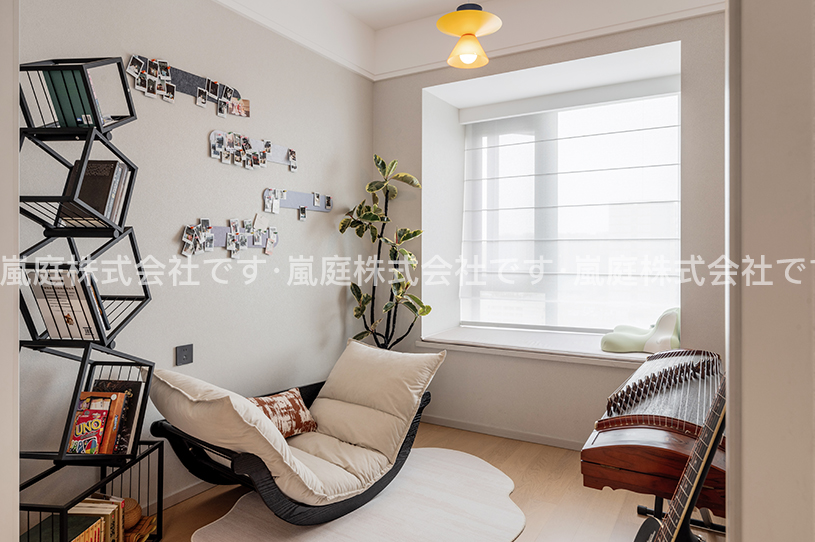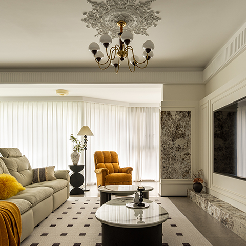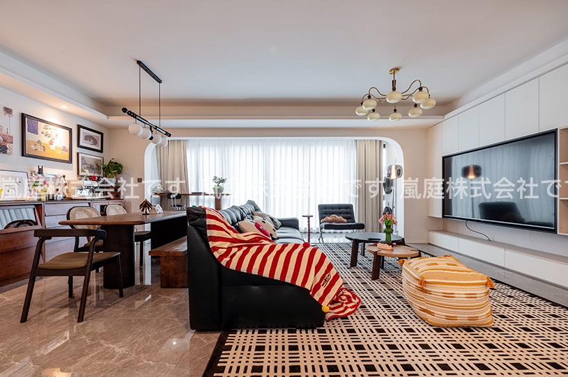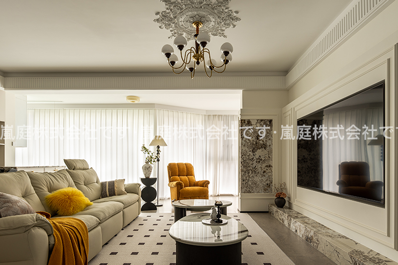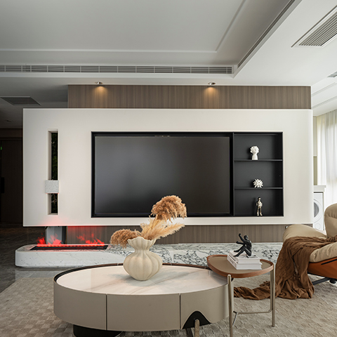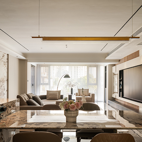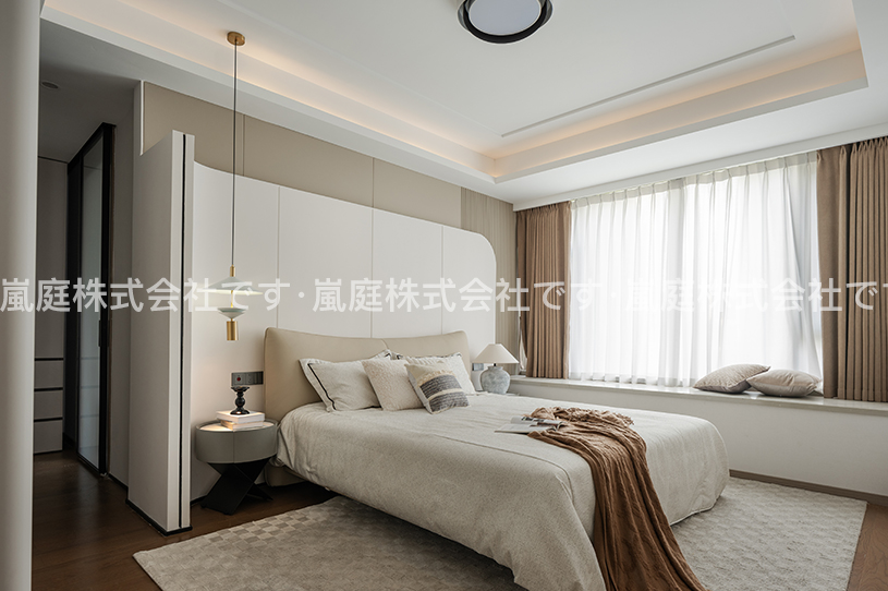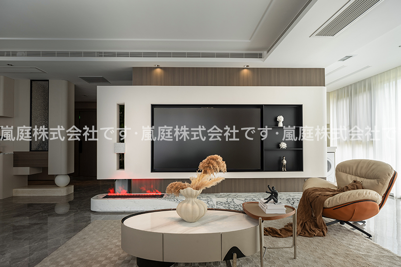 このインテリアはモダンでライトラグジュアリーなスタイルで、高級素材とニュートラルトーンが主で、ラインがシンプルで、質感と優雅さを兼ね備えている