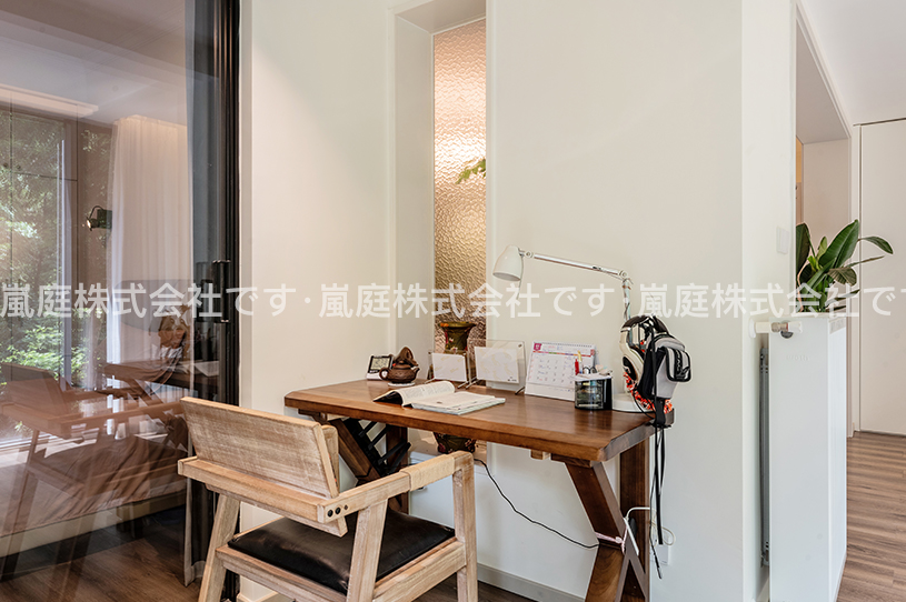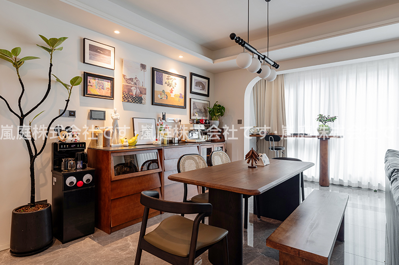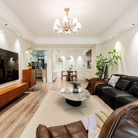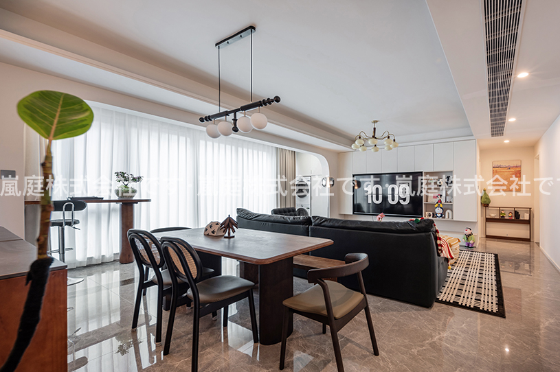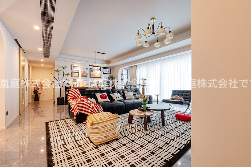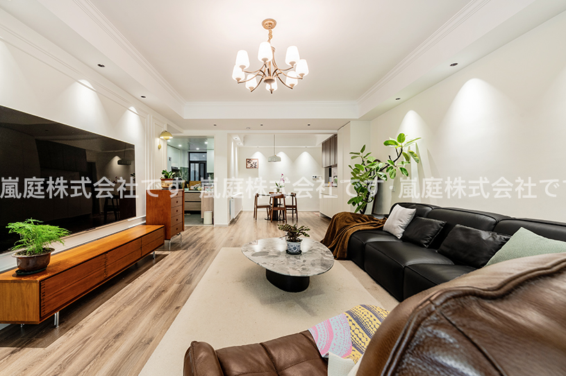 このセットはモダンアメリカンスタイルで、レザー家具や木目調の要素を主とし、レトロなシャンデリアと組み合わせて、温かみと質感を兼ね備えています。